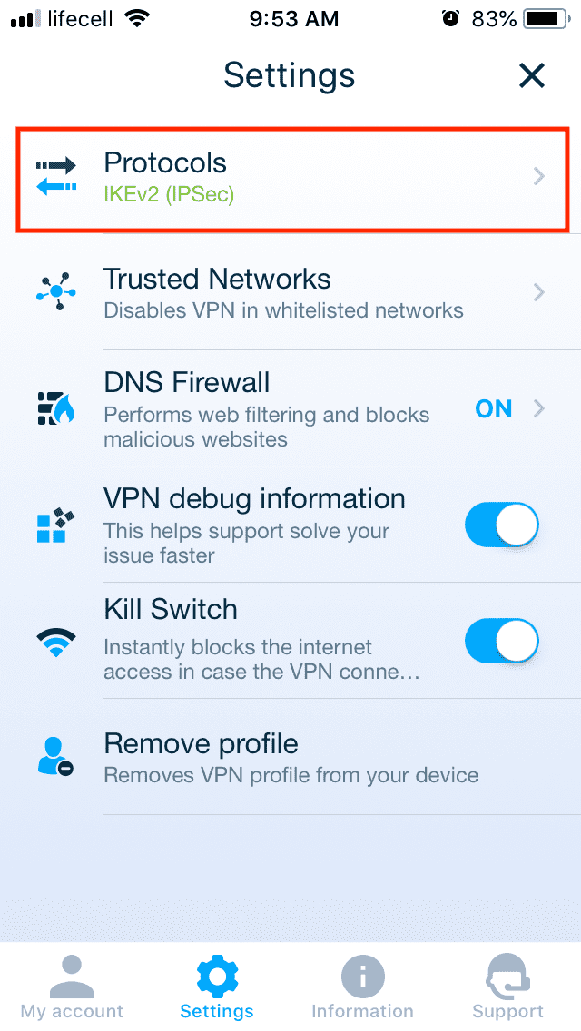 Hinweis: Wenn Ihre VPN-Verbindung aktiv ist, wird sie automatisch mit dem gewählten VPN-Protokoll neu verbunden.