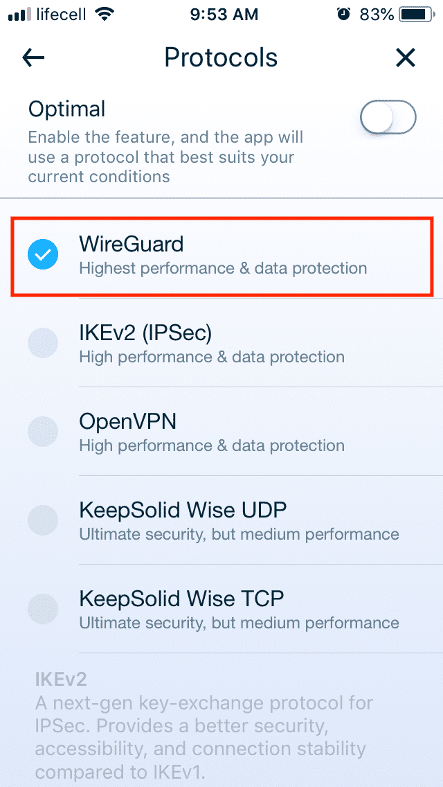 4. Wählen Sie das WireGuard VPN-Protokoll und tippen Sie auf den Pfeil in der oberen linken Ecke, um zum Hauptbildschirm zurückzukehren.