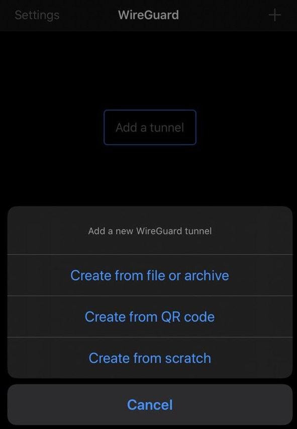 4. Wählen Sie aus, wie Sie eine WireGuard-Konfiguration erstellen möchten. Wir empfehlen Ihnen, die Methoden Create from QR-code (Aus QR-Code erstellen) oder Create from file methods (Aus Datei erstellen) zu verwenden, um mögliche Druckfehler zu vermeiden.