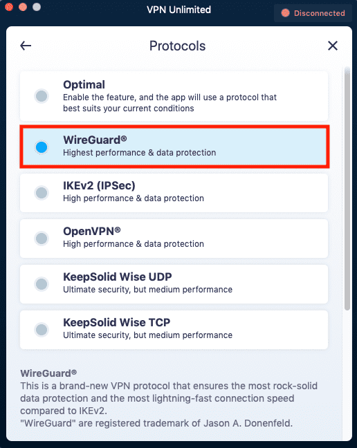 Neben WireGuard bietet VPN Unlimited für macOS eine Vielzahl weiterer VPN-Protokolle. Dazu gehören OpenVPN, IKEv2 sowie das speziell entwickelte KeepSolid Wise-Protokoll, mit dem Sie die strengsten Internetsperren überwinden können. Falls Sie nicht wissen, welches Protokoll Sie auf Ihrem Mac verwenden sollen, entscheiden Sie sich für die Optimal-Funktion – sie wählt automatisch die beste Option für Sie aus.