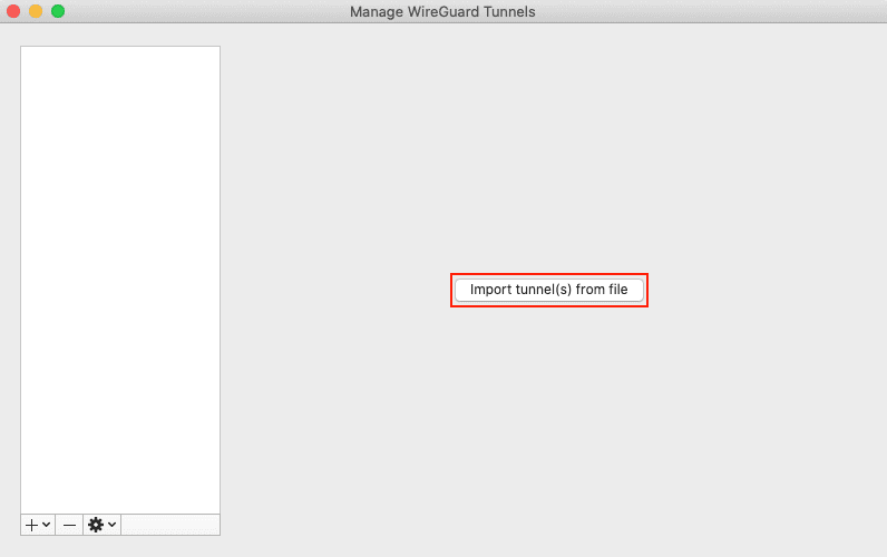 2. Nachdem Sie die WireGuard-Anwendung auf Ihrem Mac installiert haben, öffnen Sie sie, drücken Sie Import tunnel(s) from file (Tunnel aus Datei importieren) und wählen Sie die Konfigurationsdatei aus, die automatisch von Ihrem Benutzerbüro heruntergeladen wurde.