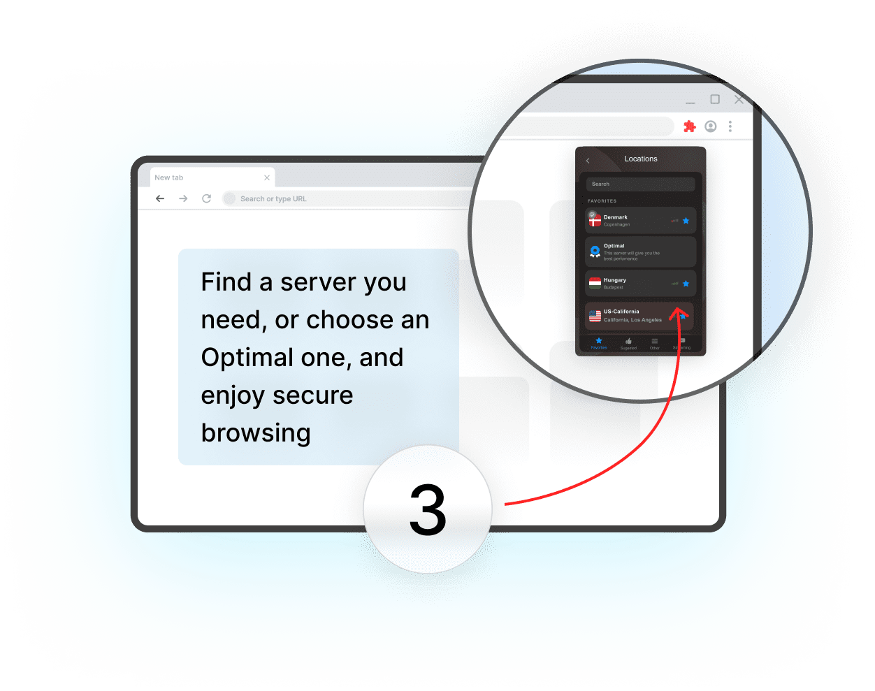 Find a server you need, or choose an Optimal one, and enjoy secure browsing