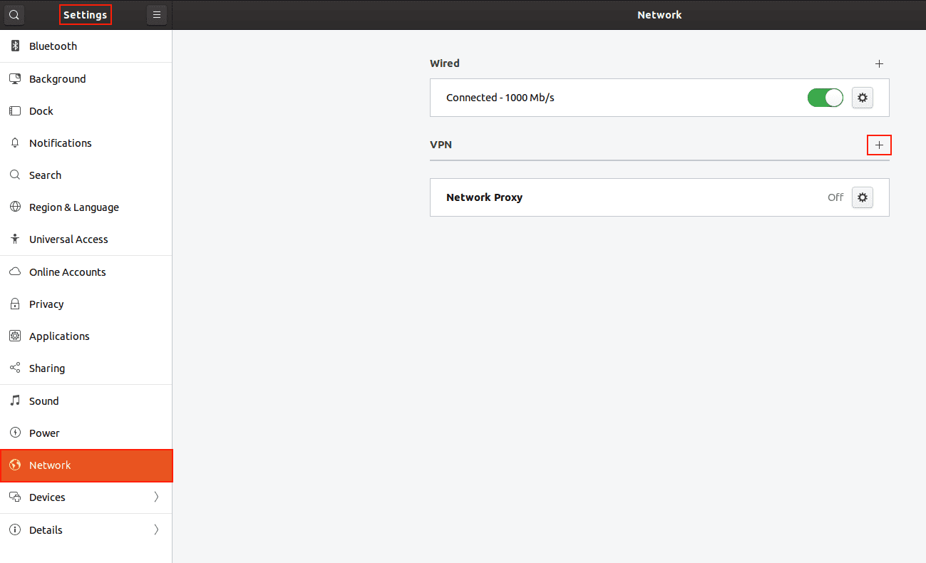 ۳. به Settings (تنظیمات) > Network (شبکه) بروید و روی + در بخش VPN کلیک کنید.
