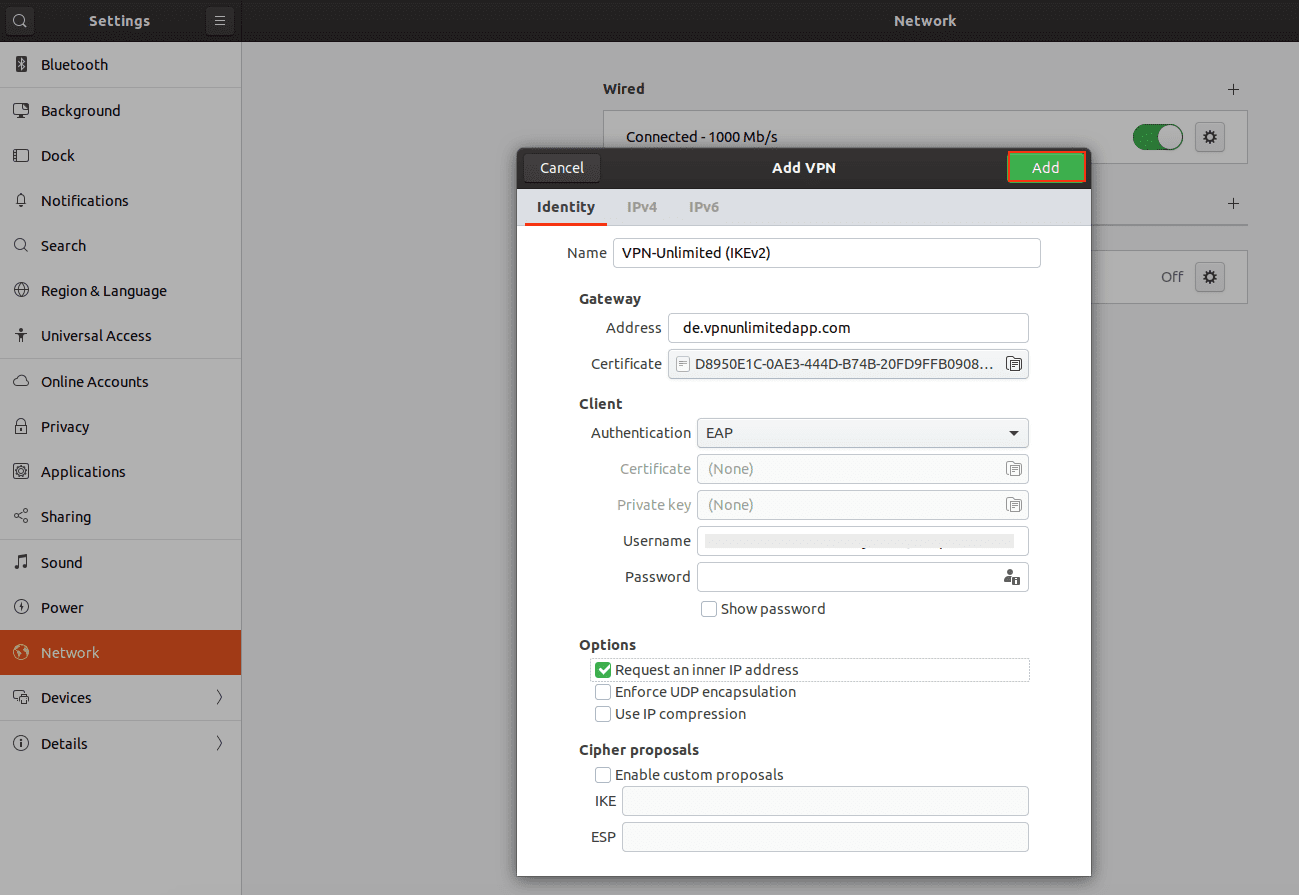 - Connection name (نام اتصال): یک نام بهدلخواه خود وارد کنید، برای مثال VPN-Unlimited (IKEv2)