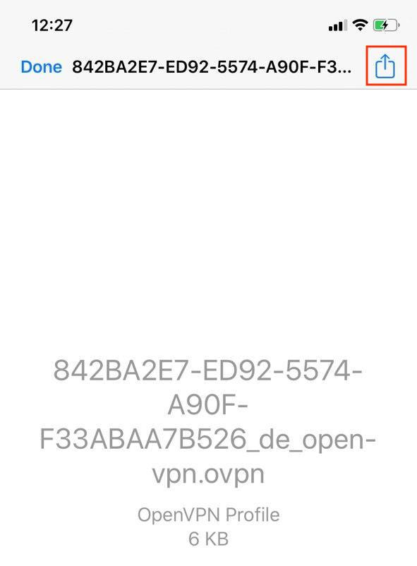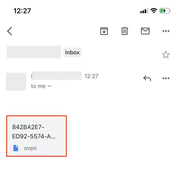 2. Open the .ovpn file on your iOS device. For example, you can send it via email. Tap at the top of the screen and select the OpenVPN Connect application.