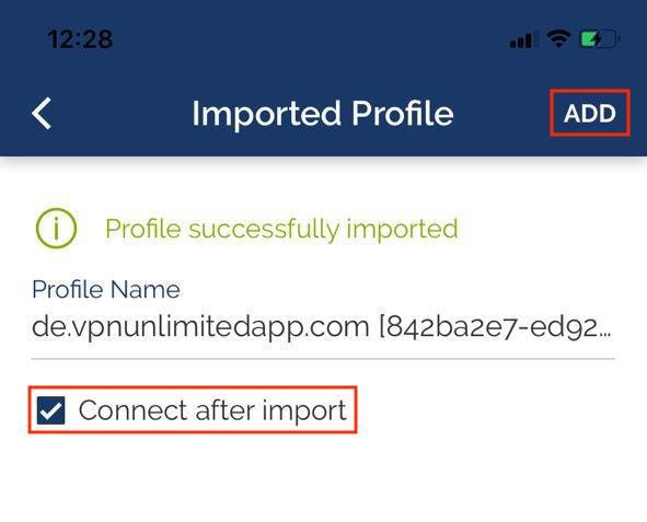 4. If you want to establish your VPN connection immediately after downloading files, select the Connect after import checkbox and click Add.