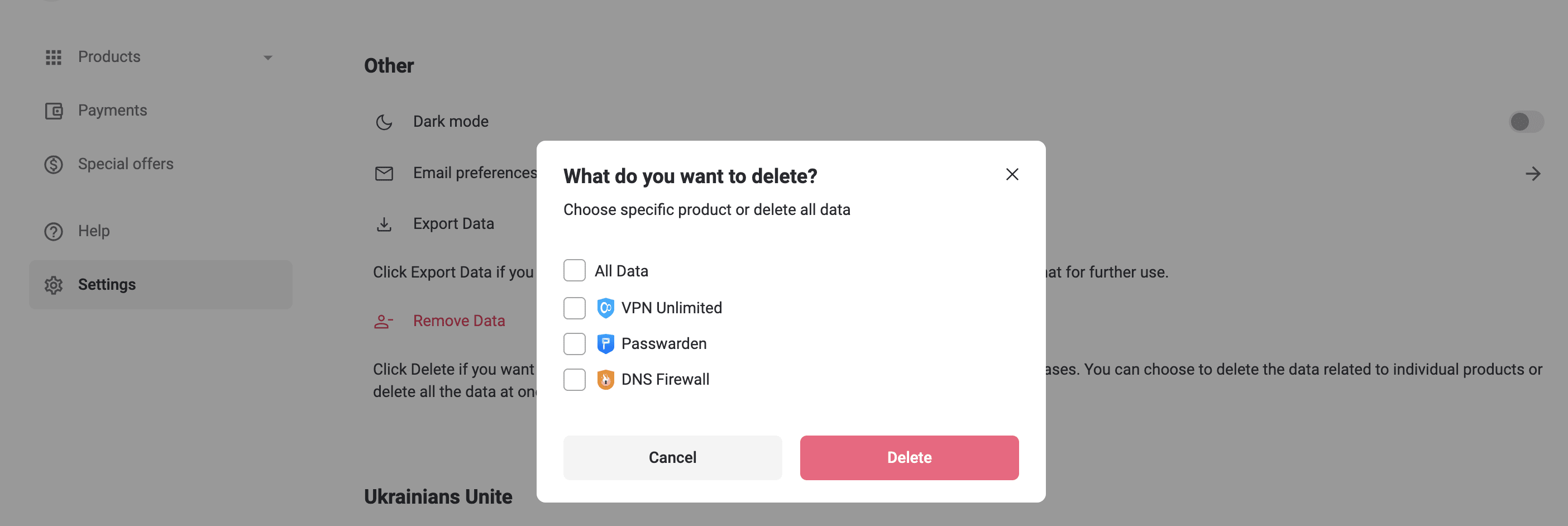 - To delete data for specific services: Select the services you want to remove (e.g., VPN Unlimited, Passwarden, DNS Firewall) and click Delete.