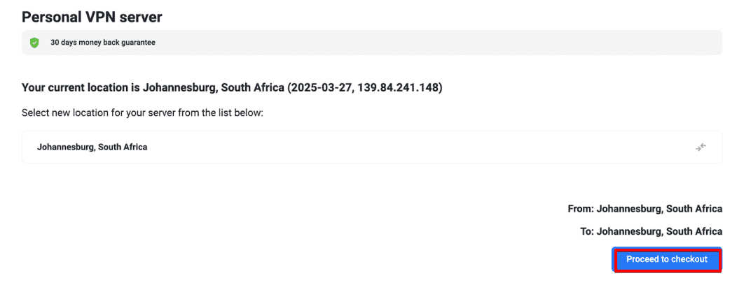 - Press Change, select the desired location, click Proceed to checkout, and complete the payment via any available method.