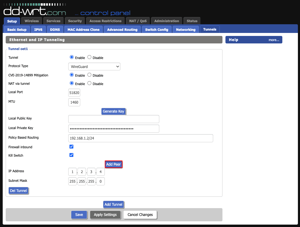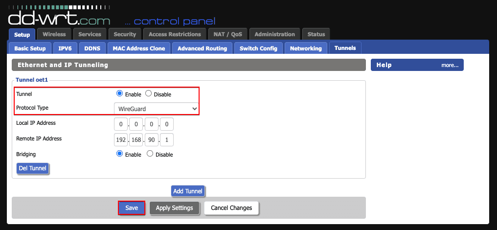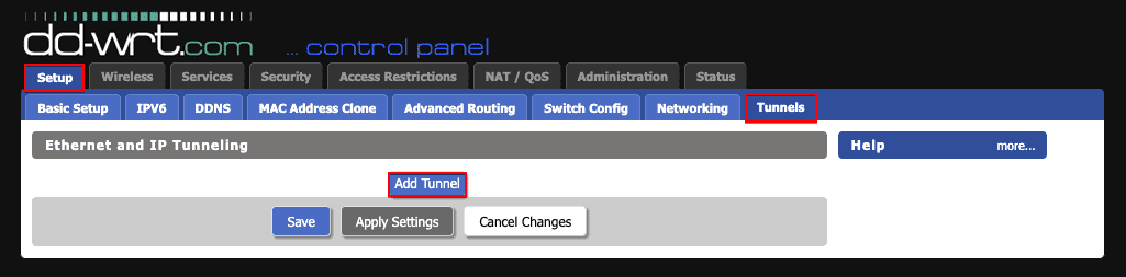 1. Open your DD-WRT router interface and go to Setup > Tunnels > press Add tunnel.