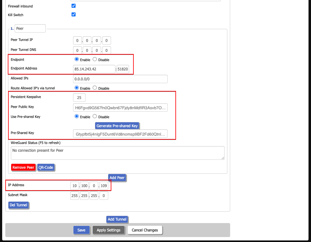 • Local Private Key: copy the PrivateKey value from the Interface section