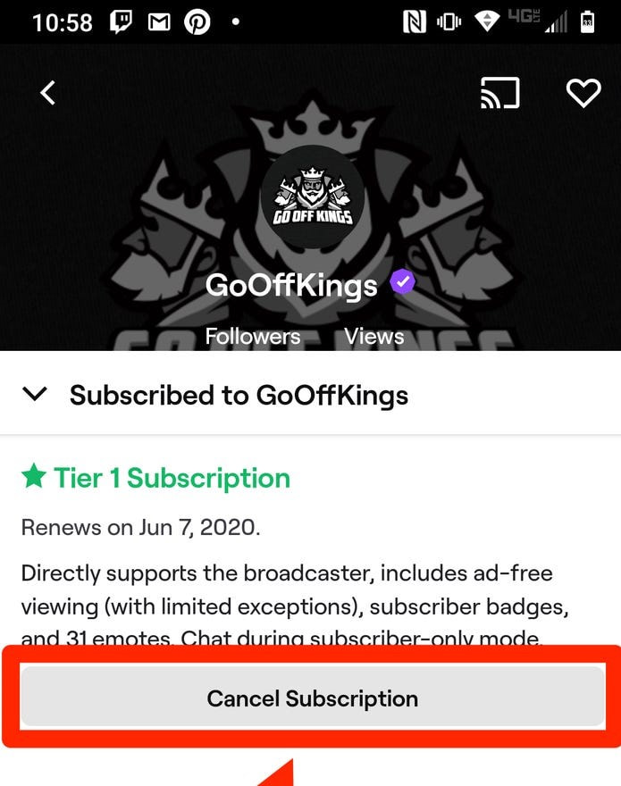 The method is different if you started your Subscription using a mobile device  You must cancel the Subscription using the Twitch Application on your mobile, the platform-specific app store, or the platform-specific website, depending on your device.