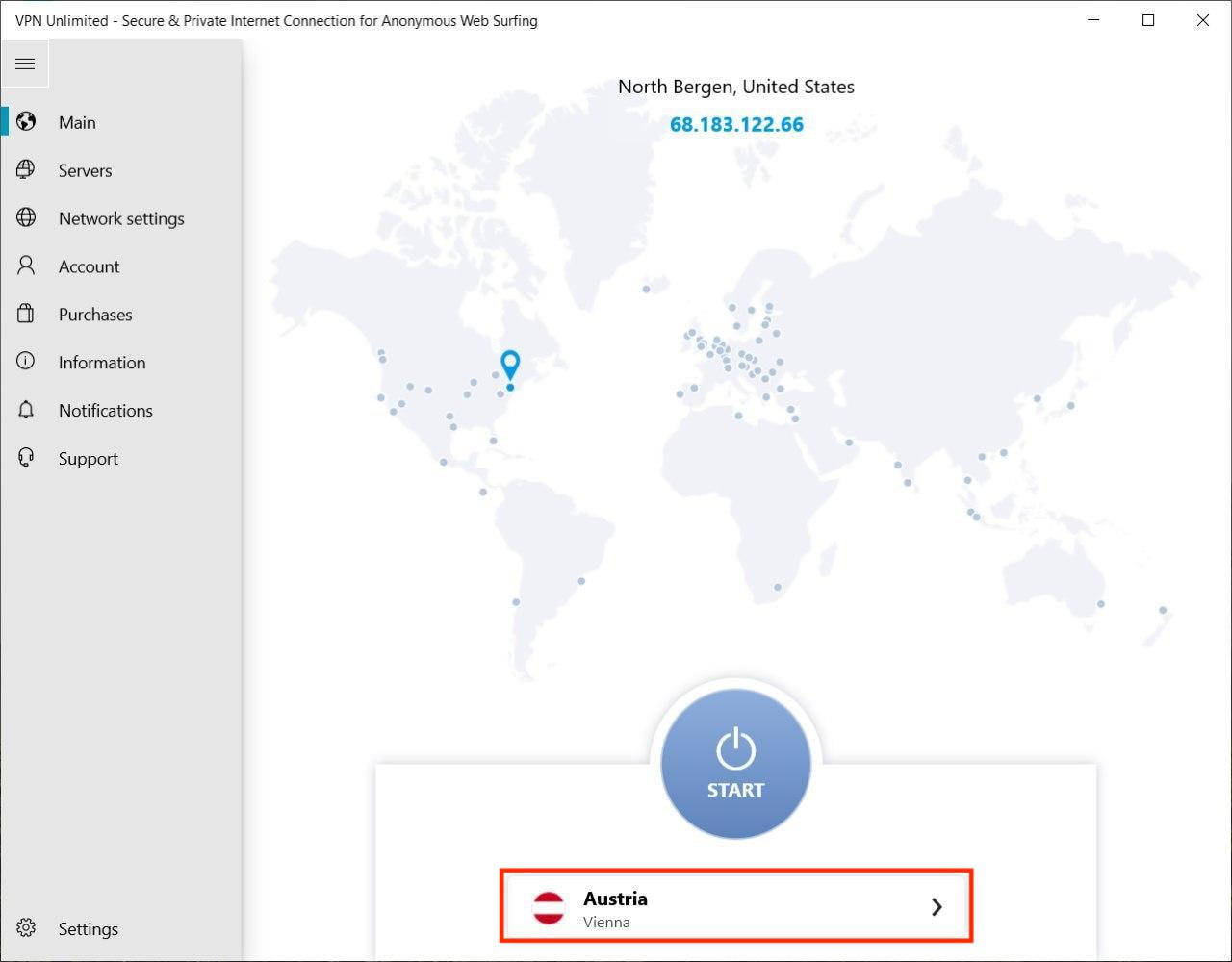 Comecemos a familiarizar-nos com a nossa VPN de primeira linha para Windows a partir da Tela Principal. Aqui verá um mapa mundial e a sua localização real. Ao clicar no botão Start (Iniciar), pode estabelecer uma ligação com o servidor VPN selecionado.