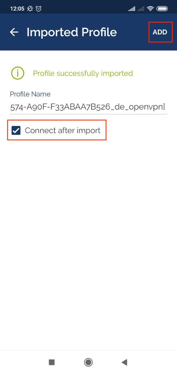 4. Если вы хотите активировать ваше VPN соединение сразу после импорта файлов конфигурации, поставьте галочку Connect after import. Нажмите Add