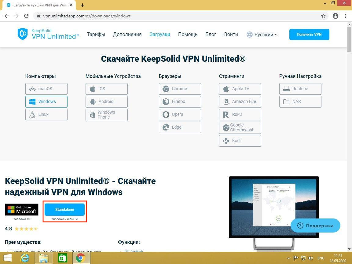 Чтобы скачать наш Windows 8 VPN клиент, перейдите на страницу Загрузки и выберите Standalone версию приложения.