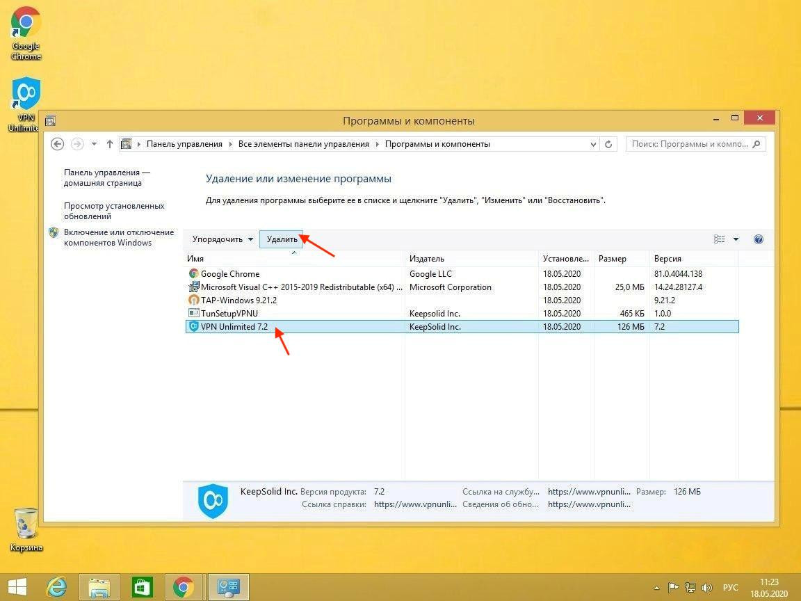 Чтобы удалить Windows 8 VPN клиент с вашего устройства, перейдите в Панель управления > Программы > Программы и компоненты. Выберите VPN Unlimited и нажмите Удалить.