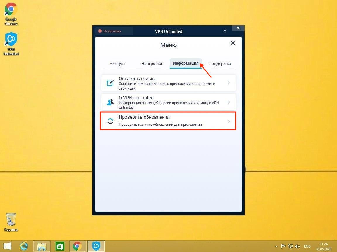 Наше приложение VPN для Windows 8/8.1 автоматически проверяет наличие обновлений при каждом запуске. Чтобы проверить наличие обновлений вручную, вам необходимо запустить VPN, перейти в Меню > Информация и выбрать Проверить обновления.