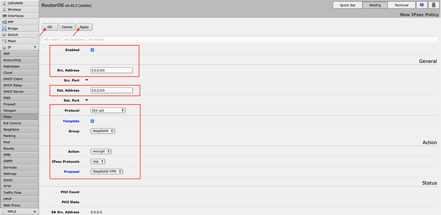 - 现在需要在您的 Mikrotik 路由器上创建一个 IPSec 安全策略。进入 Policies(策略)选项卡,然后单击 Add New(添加新策略)。按照以下内容填写字段,然后按 OK 键: