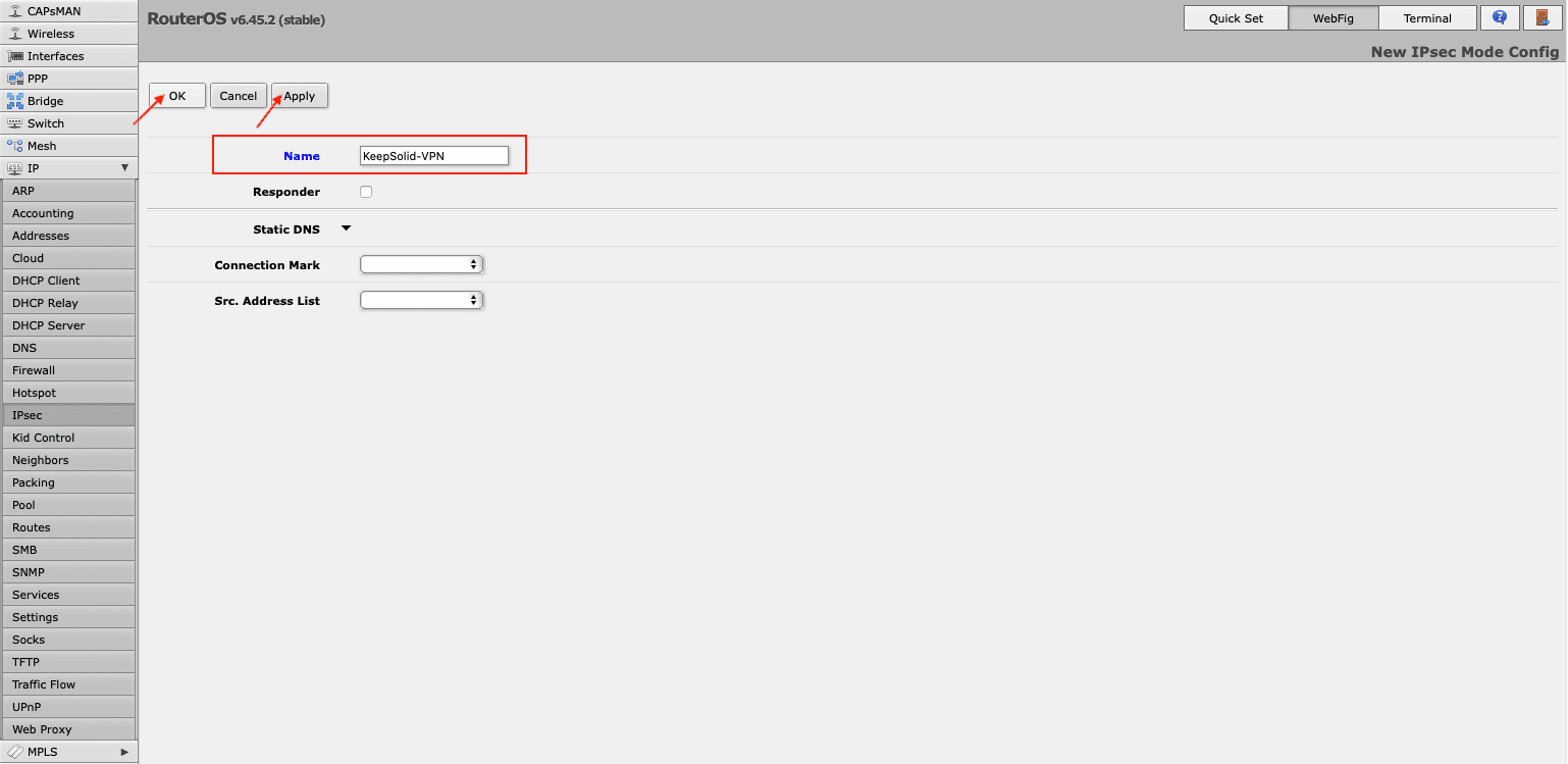 - 进入同一个 IPsec 内的 Mode Configs(模式配置)选项卡,点击 Add New(添加新配置)。输入配置的名称,点击 Apply(应用)> OK。