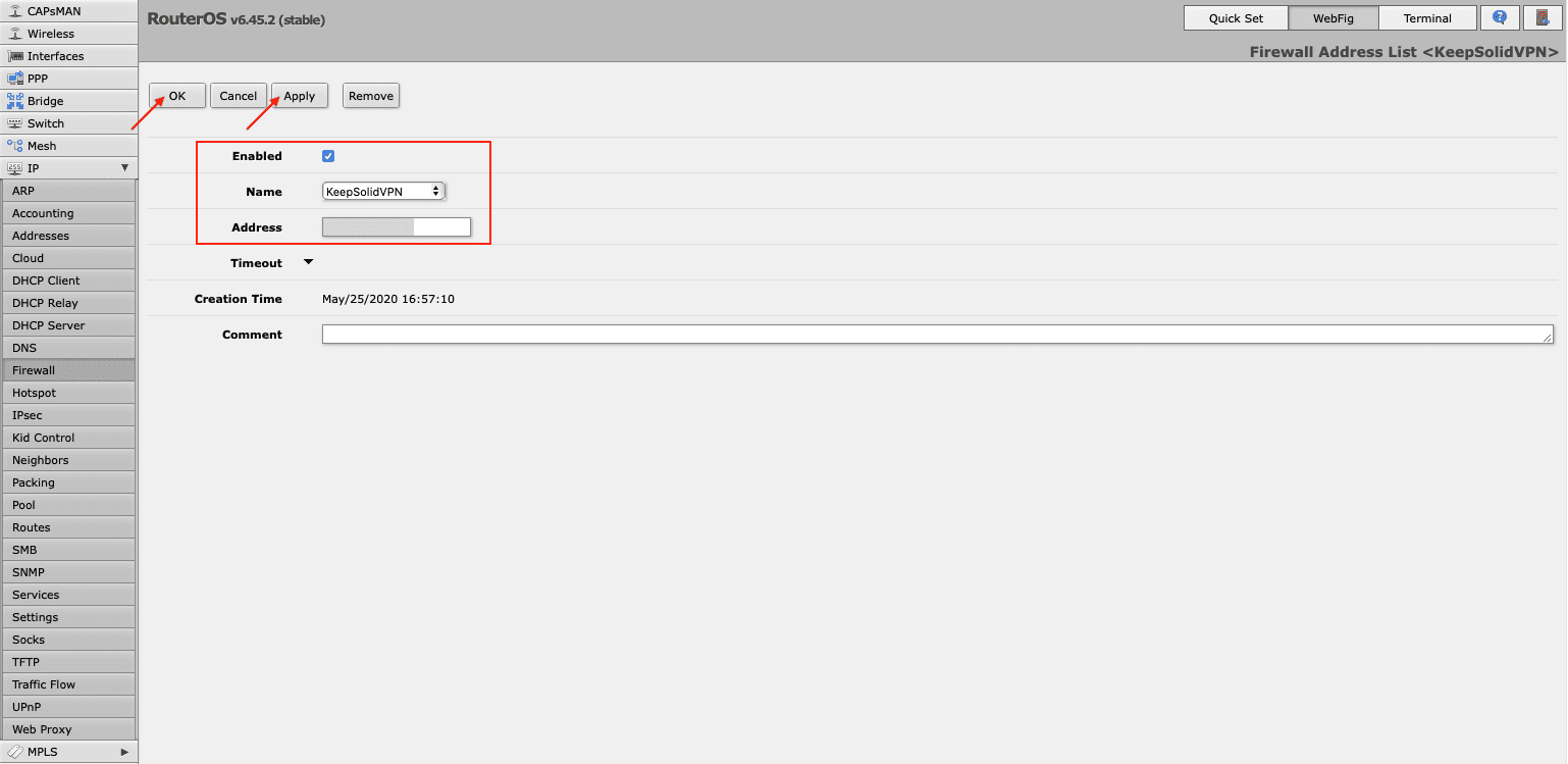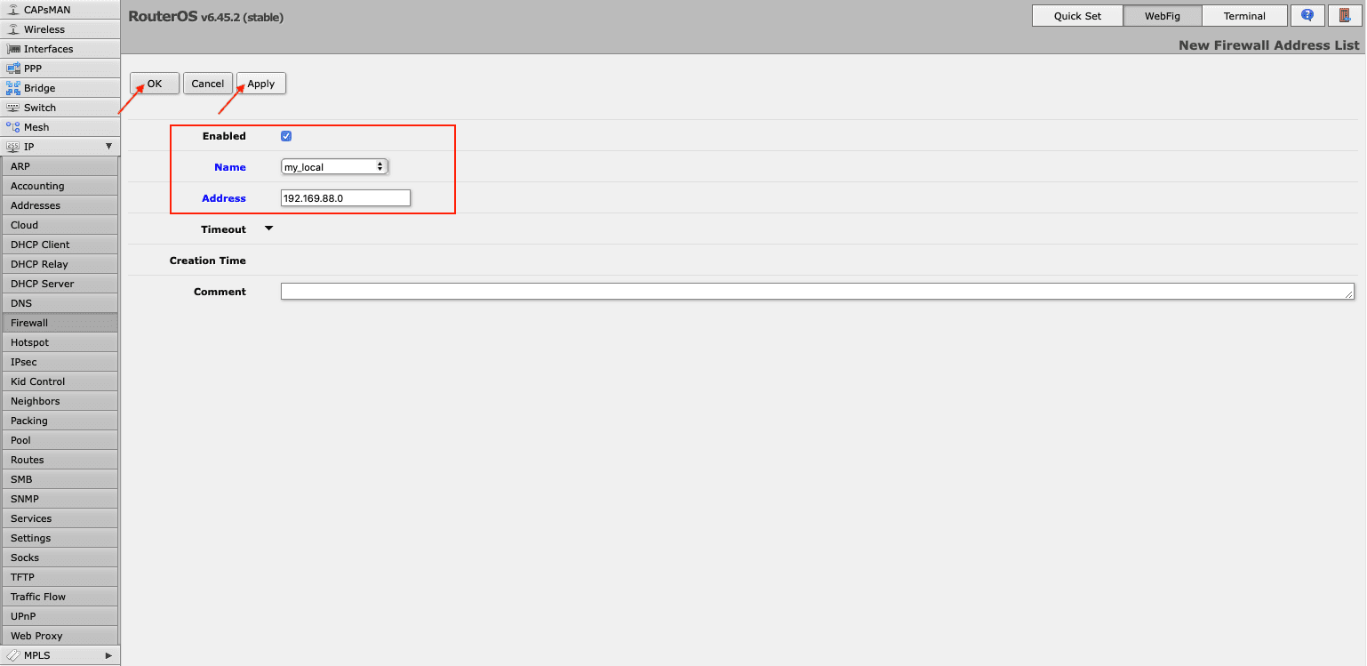 - 在 Firewall > Address Lists(地址列表)中,点击 Add New(添加新地址)将所需的 IP 地址包括在地址列表中。