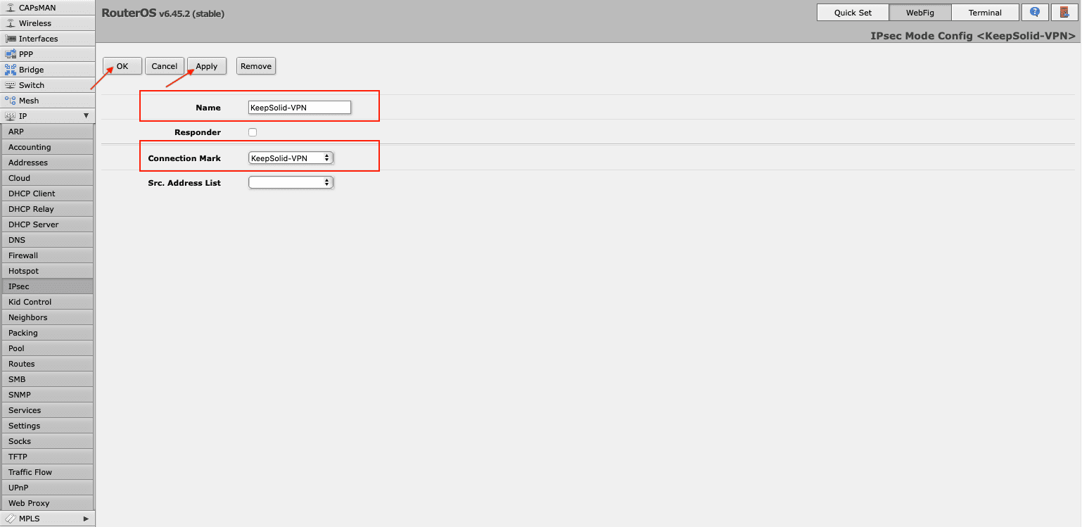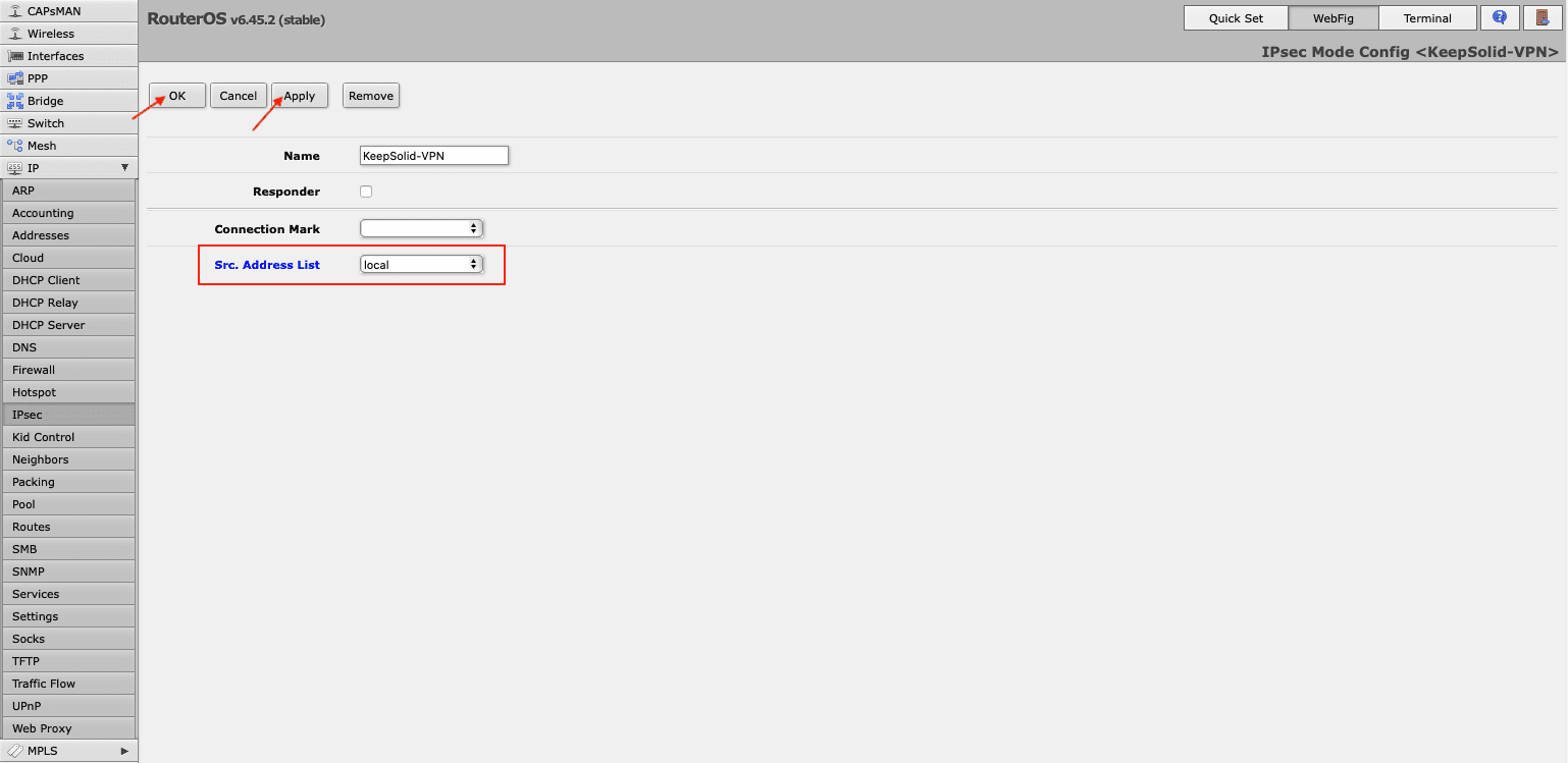 - 现在,您需要将此列表分配给模式配置。为此,请前往 IPsec > Mode Configs(模式配置)> KeepSolid-VPN,并在 Src.(来源)前的下拉菜单中选择您刚刚创建的列表。Address List(地址列表)栏。