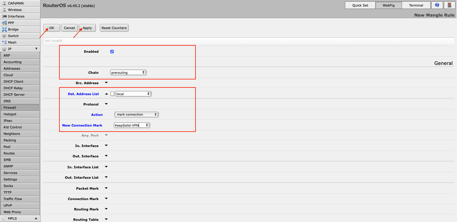 - 前往 Firewall > Mangle 以添加 mangle 规则。点击 Add New(添加)并做出以下更改: