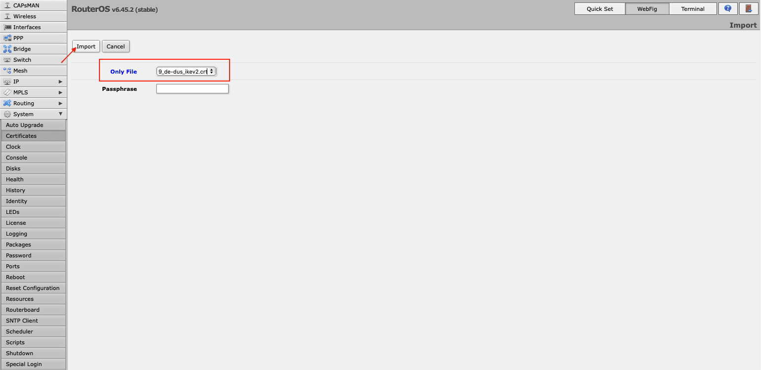 - 通过 System(系统)> Certificates(证书)> Import(导入)导入您的证书。在 Only File(仅文档)栏对面的下拉菜单中,选择您刚刚添加的证书,然后单击 Import(导入)。