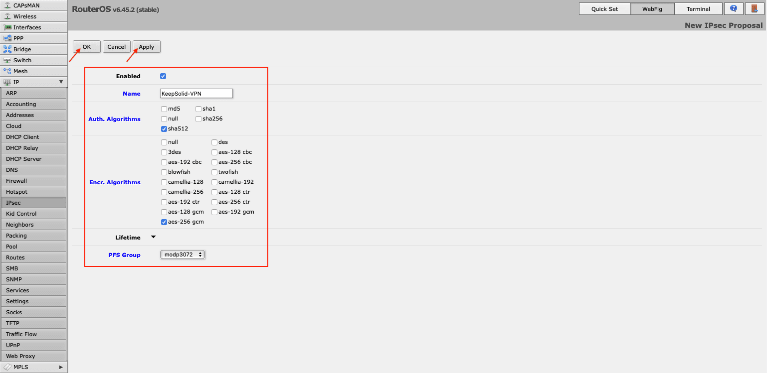 - Proposal(方案):选择您之前创建的方案,在我们的示例中即 KeepSolid-VPN。