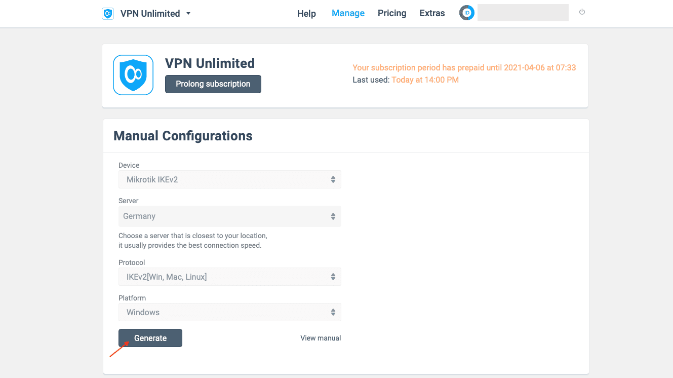在那里,您将获得在 Mikrotik 上进一步设置 IKEv2 所需的信息:所选 VPN 服务器的 IP 地址、登录名、密码和证书,您需要将这些信息保存到电脑上。